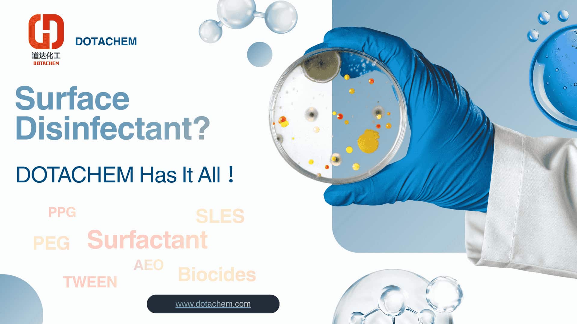 Dotachem is your one-stop supplier for the full range of Polyethylene Glycol (PEG) products—including PEG-200, PEG-400, PEG-600, PEG-1500, PEG-2000, PEG-4000, PEG-6000 and others—and complementary raw materials such as Alcohol Ethoxylate (AEO) series, Sodium Lauryl Ether Sulphate (SLES), Polyoxyethylene Sorbitan Fatty Acid Ester (TWEEN), Propylene Glycol (PPG) and other functional additives, supporting every stage of disinfection formula development.