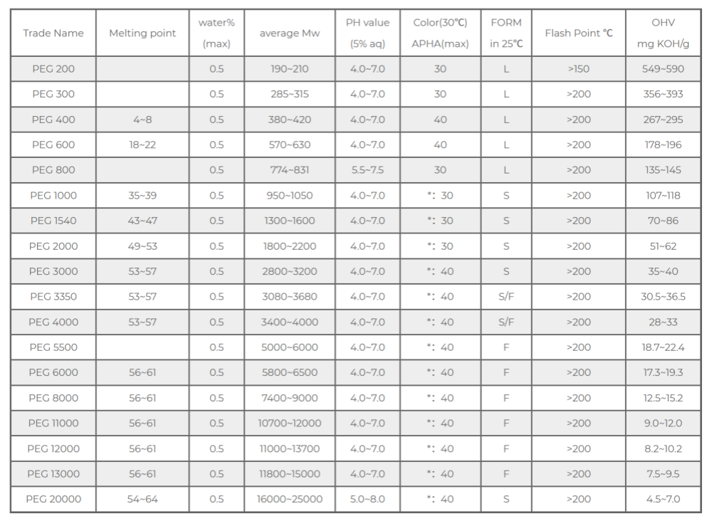 PEG-1000 to PEG-4000: Medium molecular weight, waxy solids. As the molecular weight increases, so do the viscosity and melting point. For instance, PEG-3350 is a commonly used suppository and ointment base in pharmaceuticals, offering good formability and drug release performance.